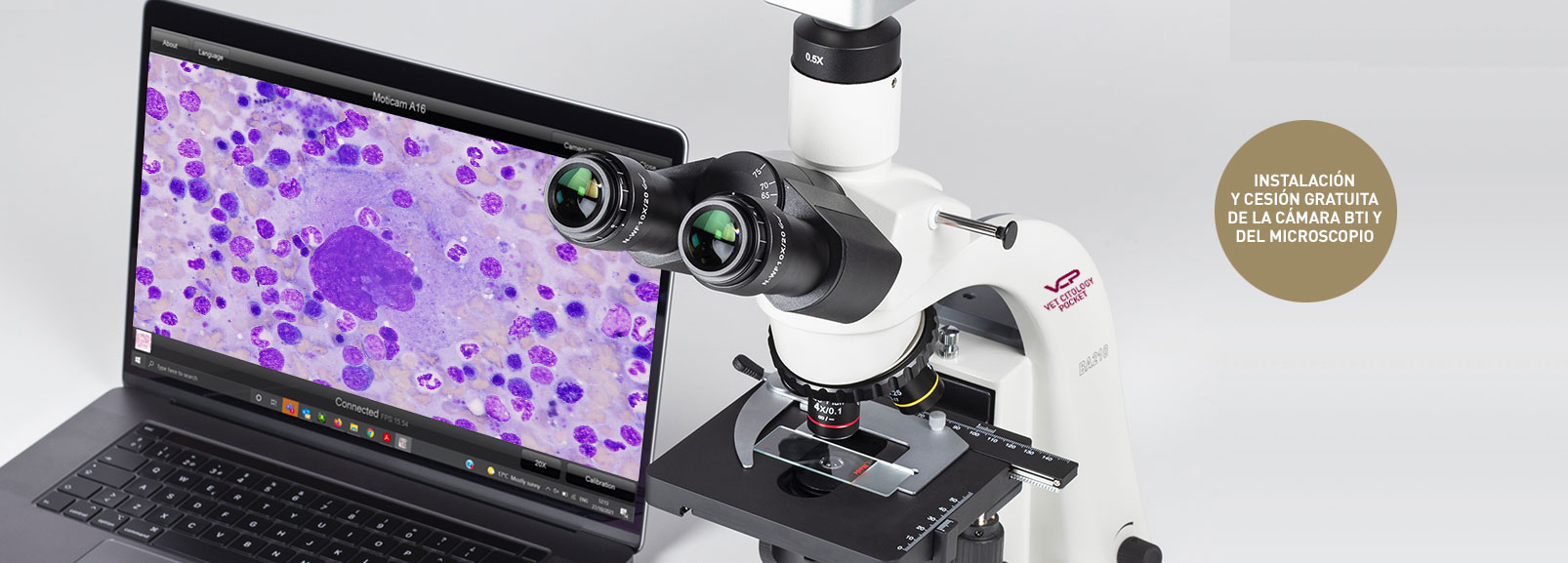 Con esta opción Vet Citology Pocket Premium te instalamos Gratis sin Coste en tu Clínica el Microscopio y la Cámara BTI (valorado en 2.200 €) para Digitalizar directamente las Imágenes Citológicas y que puedas recibir el Informe Citológico en menos de 4 Horas.